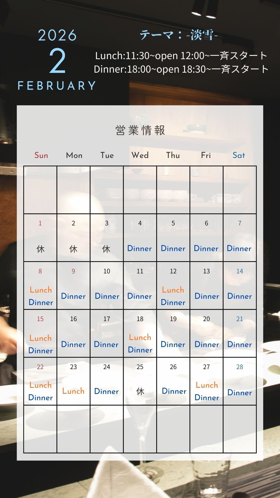 一皿ごとに感動をその一皿が、人と人の“縁”を結んでゆく一皿一皿に、心に残る余韻を込めて お知らせ NEW!(2月)のテーマ… 淡雪(あわゆき) 春先などに降る消えやすい雪。降っても、すぐに消えていく春の雪。 テーマ食材…鯉 平貝 カカオ (1月)のテーマ… 初笑 (はつわらい) 新年になって、初めて笑うこと。「笑う門には福きたる」ということば通り、一年が笑いに満ちた幸多い年であるようにという祈りが込められている季語。 テーマ食材 … 寒鰤 数の子 金柑 ご予約受付中 五感で味わう空間 ジャンルに縛られず、新しい発想で仕立てる革新的なコース料理。 寄り添い、撚り合い、繋がる“縁”を大切に、料理人との対話から生まれる一皿一皿に、心に残る余韻を込めて。YORIは、人と料理が交差する特別な場所です。 MENU 旬を映し、感性で仕立てる 特別なコース YORIでは、月ごと・季節ごとに変わる唯一のコースをご用意しています。和・洋・中の枠を越え、選りすぐった食材を、最も美しい形で一皿に。繊細な味わいが、素材の魅力をそっと引き出します。 “YORI”に込めた五つの想い 縁(より)—人とのご縁を、何よりも大切に。 寄り(より)—大切な人と、ふと立ち寄れるような場所に。 撚り(より)—多彩な料理、仲間、お客様が撚り合い強く美しい一本の糸になるように。 選り(より)—素材も技も、選び抜いたものだけをお届けします。 より―昨日より今日、今日より明日へ。 常に進化を続ける店として。 ご縁を大切にし、大切な人と“寄り”たくなる場所でありたい——。さまざまな料理や仲間、お客様の想いが撚り合い、一本の太い糸のように、 強く温かなつながりとなるように。選りすぐりの食材と真摯な技で、心に残る一皿をお届けしたい。そして、昨日より今日、今日より明日へと、常に成長し続ける店でありたいと願っています。